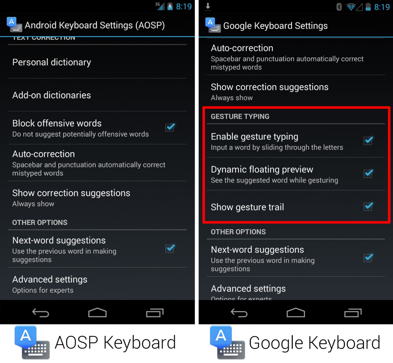 Even the keyboard is not safe from closed source creep. A few months ago, Google added Swype-like gesture typing to the stock keyboard, which was released as a new app in the Play Store called "Google Keyboard." Guess where the source code for that is? Not in AOSP. Above, you can see the settings for the two keyboards. The Google Keyboard has options for swipe typing, and AOSP doesn't—it was abandoned as soon as Google Keyboard was released.