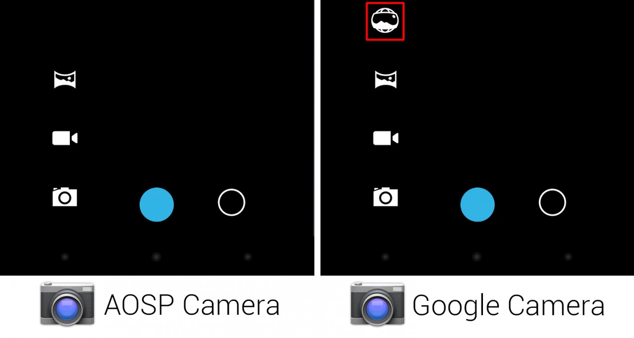 The Camera and Gallery are actually a single APK (Android application package file). The AOSP version is called "Gallery2.apk," and Google's version is called "GalleryGoogle.apk." As you can see in the above picture, Photospheres are exclusive to the Google version—the innovative camera mode is not available on AOSP. The open source version also omits any Google+ album integration. The normal behavior is to display cloud-based Google+ albums alongside local ones.